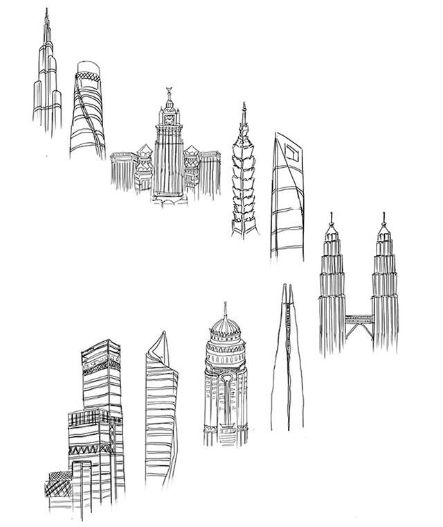 哈利法塔、上海中心大厦、麦加皇家钟塔、台北101大厦、上海环球金融中心、双子塔、乐天超级塔、公主塔、Al Hamra大厦、阿倍野HARUKAS摩天大楼