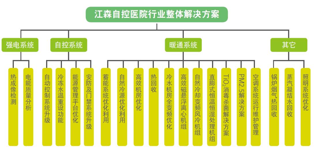 江森自控对医院客户所关心的管理、节能等问题进行深入的研究分析,通过大量的设计与计算制定的技术方案切实有效,提供的常用节能解决方案包括: