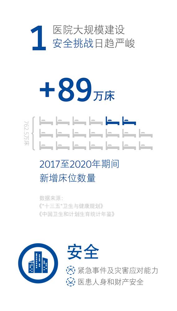 医院对“安全、舒适、可持续”的需求包括“基本需求”和“高级需求”两个层面:安全方面从“确保医患人身和财产安全”到“针对紧急事件及灾害的应对能力”;舒适性方面从“诊疗环境的健康和舒适度”,到“病患满意度以及诊疗效率”;可持续上从“节能减排”到“提升医院运营效率和更好的财务表现”。